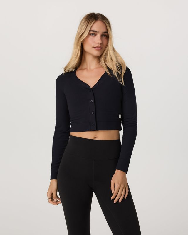 Made with our soft stretch rib knit, the Long Sleeve Pose Mini Cardigan offers lightweight comfort and easy styling. This semi-fitted women’s cardigan features a deeper plunge neckline with a front button closure, and a slightly cropped length.