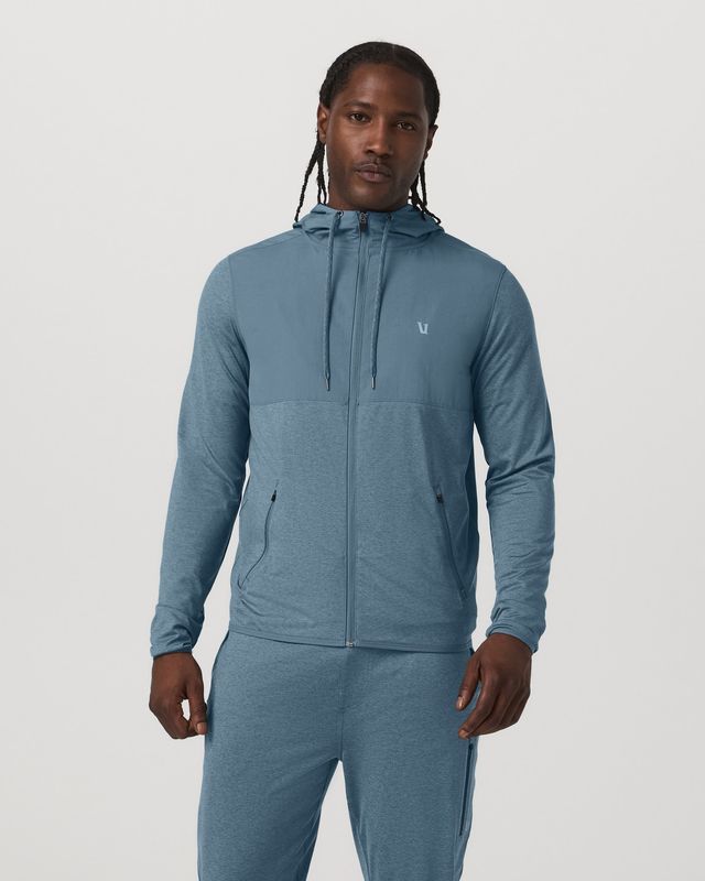 This jacket checks the boxes for both soft performance stretch knit plus a protective nylon shell from 88% recycled material to help protect from the elements. Moisture-wicking fabric along with nylon overlays, a drawcord hoodie, and zip pockets keep you in check. Great for training and running.